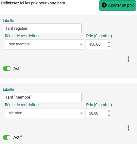 | Note : les tarifications font partie des valeurs par défaut des nouvelles sessions. IMPORTANT! Le tarif payé par l'utilisateur qui s'inscrit est celui des paramètres de la session. | |