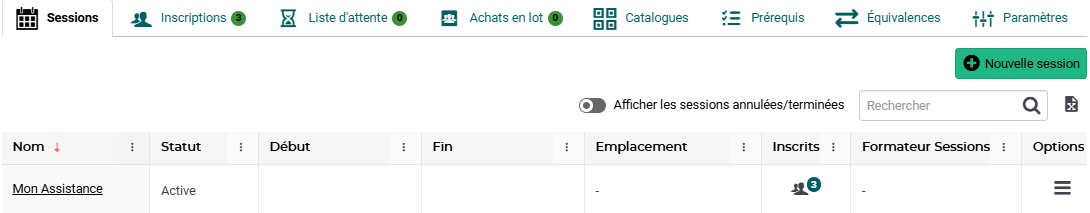 L'onglet « Sessions » de la formation présente l'ensemble des sessions de la présente formation. Vous pouvez aussi y créer de nouvelles sessions, qui hériteront des valeurs par défaut de la formation, c'est-à-dire certains des paramètres de l'onglet « Paramètres » de la formation. | ![]() |