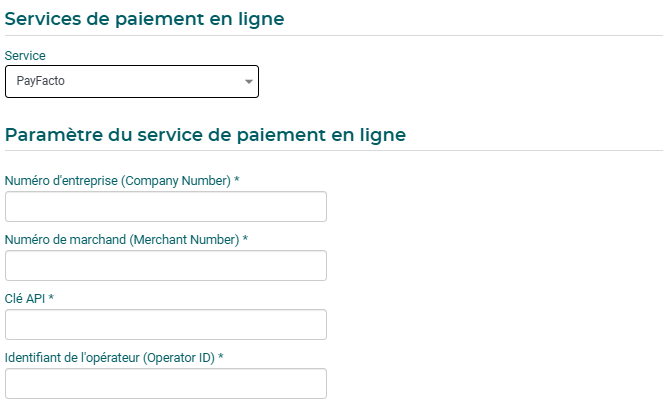 La section « Paramètres du paiement en ligne », finalement, sert à déposer les informations techniques obtenues lors de votre création de compte chez PayFacto: