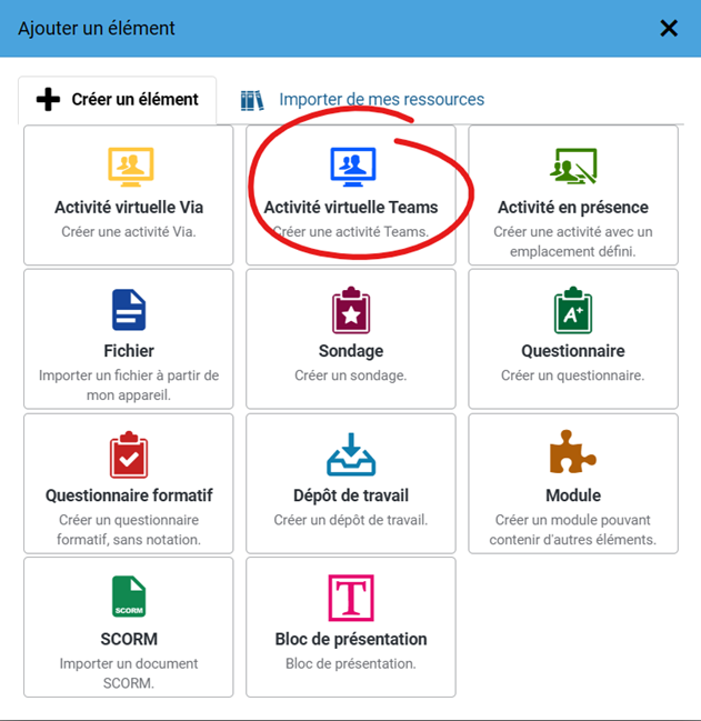 Pour en savoir davantage sur la création et le paramétrage d'une Activité virtuelle Teams, consultez l'article Créer et gérer le contenu des sessions.